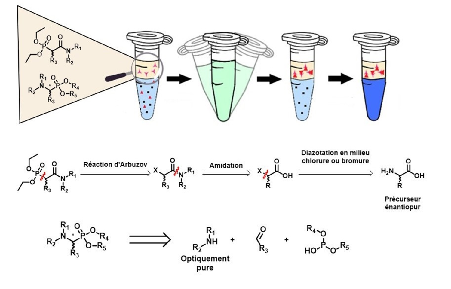 The nuclear fuel cycle involves considerable challenges for the future of nuclear power. Among the hydrometallurigical processes used for metal extraction and recycling, such as for uranium, liquid-liquid extraction is one of the most commonly used techniques. Bi-functionnal ligands such as amido- and aminophosphonates are recognised as effective specific uranium extractants. Several studies have demonstrated that the stereochemistry of an extractant influences metal extraction. Using one diastereoisomer rather than another, or a mixture of isomers, can significantly alter extraction efficiency. In this context, the aim of this thesis is to develop methodologies for the asymmetric synthesis of chiral amido- and aminophosphonates. Three pathways were studied for amidophosphonates, By the end of this study, it had been demonstrated that the total synthesis from an amino acid precursor was the only approach for obtaining stereo-enriched amidophosphonates. Regarding aminophosphonates, the stereoselective Kabachnik-Fields reaction assisted by a microwave heating was studied. The influence of the regioselectivity of the chiral amine on the stereoselectivity of the reaction was also examined. These diastereoisomers were subsequently studied in liquid-liquid uranium extraction from nitric acid in order to investigate the effect of their stereochemistry on extraction efficiency. The results confirm that the stereochemistry of the ligands affects the extraction process. It appears that steric hindrance limits the formation and stability of the complexes.