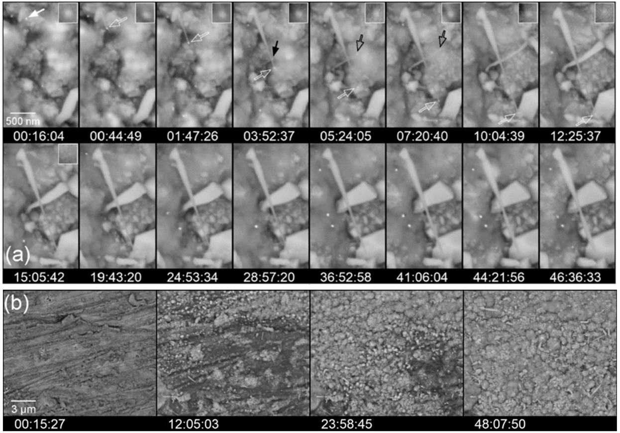 Team L2MEAs part of the ANR Aluplat project, which brings together ICSM and three other national laboratories, an automated control program for an environmental scanning electron microscope has been developed. It enables the automatic acquisition of images at different magnifications and over multiple regions of interest, while adjusting focus (focus and astigmatism) and ensuring accurate centering of the regions of interest, over periods of several days. This system was used to characterize the oxidation of single-crystal nickel-based γ/γ′ superalloys over 120 hours at 920 °C. The localized (both spatially and temporally) formation of NiO whiskers was revealed, and their formation mechanism was explained.