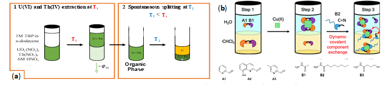 Le développement de systèmes adaptatifs a en parallèle été envisagé par une approche basée sur la mise en œuvre de bibliothèques covalentes dynamiques : Contrairement à la méthode classique où une seule molécule est conçue pour extraire des cations métalliques dans des conditions spécifiques, la chimie covalente dynamique permet d’induire la génération des espèces extractantes en fonction de la composition du milieu. En collaboration avec le LCS (ISIS), l’équipe LHYS a appliqué cette approche à l’extraction du nitrate de cuivre (II) par une phase organique basée sur une bibliothèque dynamique de constituants type acylhydrazone qui s’auto-construisent et se distribuent au sein du système biphasique (b). L’ajout de cations cuivre(II) à cette bibliothèque déclenche une modification de sa composition et la régulation des molécules de ligand entraînée par la coordination aux cations métalliques (thèse A. Chevalier, puis thèse R. Moneuse).