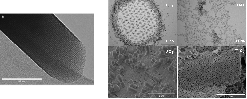 L’approche intègre aussi l’aspect fin matière par la préparation directe et contrôlée de matériaux d’actinides, purs ou en mélange, organisés à l’échelle nanométrique (thèse M. Henry). Comme les matériaux hybrides organisés à l’échelle nanométrique peuvent afficher des propriétés inhabituelles par rapport aux matériaux inorganiques classiques, l’équipe a développé deux approches bottom-up pour viser la préparation contrôlée de ce type de matériaux. Tout d’abord, nous avons développé une approche en une seule étape menant à des nano-feuillets lamellaires par l’utilisation d’un système moléculaire ternaire (acide dicarboxylique, oléylamine, oxyde de dibenzyle, thèse E. Ré). Dans ces nano-feuillets, la distance interlamellaire peut être ajustée en fonction de la longueur de l’acide dicarboxylique employé. La seconde approche, basée sur la fonctionnalisation de nanoparticules, a montré qu’il était possible d’utiliser la chimie click ainsi que les interactions électrostatiques pour construire des matériaux organisés par association de nanoparticules.