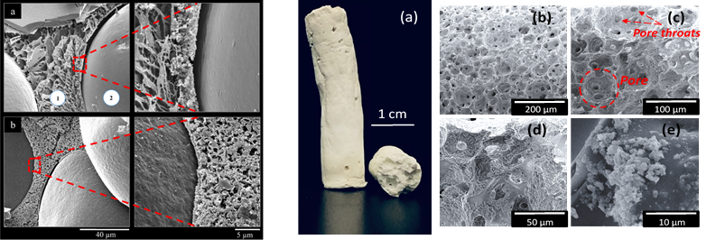 Finalement, de manière plus générale, afin de répondre au manque de possibilités de mise en forme des matériaux poreux avec une large applicabilité, nous avons développé, en collaboration avec une équipe du CEA Marcoule, une approche de préparation de matériaux hiérarchiquement poreux basée sur la stabilisation d’émulsions de Pickering au moyen de MOF (thèse F. Lorignon). D’autres moyens de mise en forme de matériaux à base de MOF sont en cours d’étude au laboratoire, comme l’impression 3D (contrat ou le dépôt sur couches minces (thèse G. Genesio, post-doctorat B. Mortada).