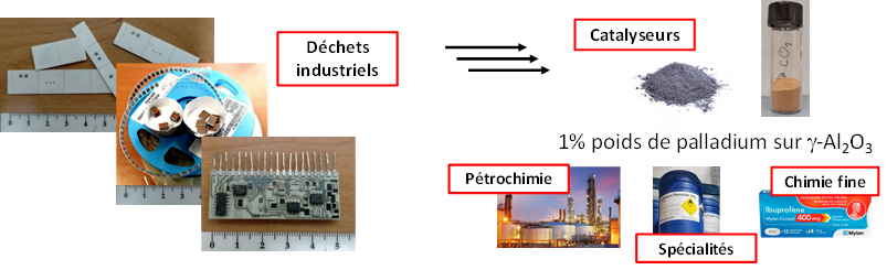 • En premier lieu, en cycle ouvert, par la valorisation directe après récupération des métaux précieux (Pd, Au) contenus dans des déchets électroniques ou industriels : Sur la base des études fondamentales déjà publiées, l’équipe a développé différentes approches hydrométallurgiques pour la récupération du Pd. En collaboration avec différents groupes, il a ensuite été possible de proposer une voie de recyclage courte du Pd par sa valorisation directe sous forme de catalyseur (thèse V. Lacanau). Ces travaux se poursuivent dans le cadre du projet CAREME financé par l’ANR et coordonné par l’équipe (thèse M. Martin Romo y Morales, contrats A. Brunet-Manquat et D. Nikolaievsyi). Enfin, signalons que toutes les recherches menées dans ce domaine ont conduit à une collaboration étroite avec la société SOVAMEP pour optimiser la récupération des métaux précieux. Cette collaboration s’est récemment renforcée par l’obtention d’un financement BPI France 2030 (projet MOTRIS).