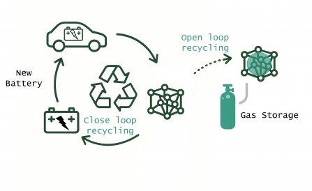 • Ensuite, en cycle fermé dans le cadre du développement de précurseurs de matériaux pour le stockage de l’énergie : Le stockage d’énergie et son économie circulaire représentent un enjeu sociétal majeur pour les années à venir. Dans ce domaine, l’équipe LHyS s’intéresse vivement au cycle des batteries Li-ion et plus particulièrement à celui de l’électrode active par une approche intégrée reposant sur divers procédés hydrométallurgiques. Ce cycle comprend la fabrication, la dissolution et la séparation des espèces dans un cycle fermé principalement basé sur l’utilisation de matériaux hybrides type MOF (Metal-Organic Frameworks, thèses M. Cognet et T. Riant). Toutes ces actions comprennent des études fondamentales et appliquées et impliquent plusieurs groupes externes nationaux et internationaux, dont le projet SCARCE.